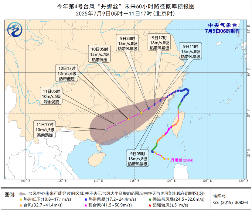 预计,“丹娜丝”将以每小时15-20公里的速度向西偏南方向移动,强度缓慢减弱。