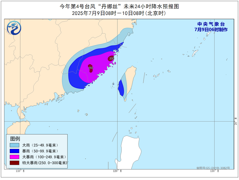 降水预报:7月9日08时至10日08时,浙江东南部、福建大部、台湾西南部、江西南部以及广东东部等地有大到暴雨,其中,福建东部和中南部、广东东部等地的部分地区有大暴雨,局地特大暴雨(250~300毫米)。