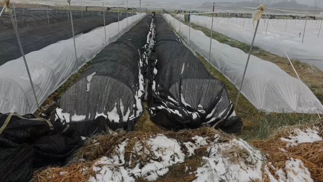 在清江乡车下村的果树苗木种植基地,田间地头覆盖着一层积雪。雪停后,基地工人们第一时间来到田间除雪,抓紧为苗木铺设防寒膜和防寒网,通过加强物理覆盖,减少低温与风冻对幼苗的影响。