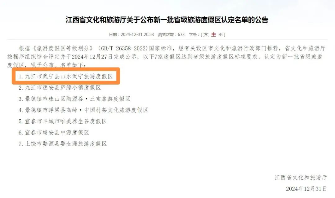 12月31日,江西省文化和旅游厅官网发布《关于公布新一批省级旅游度假区认定名单的公告》,其中山水武宁旅游度假区榜上有名,被认定为“省级旅游度假区”。