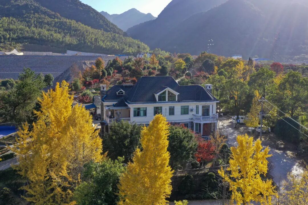 在武宁县罗坪镇岭上民宿周边,连绵山峦间,500余株银杏树已披上“金装”。阳光穿过层层叠叠的叶片洒落林间,整片山林熠熠生辉。微风拂过,落叶翩跹如蝶,地面宛如铺上金色地毯。游客穿梭其中,或驻足拍照,或嬉戏玩叶,尽享冬日自然之美。